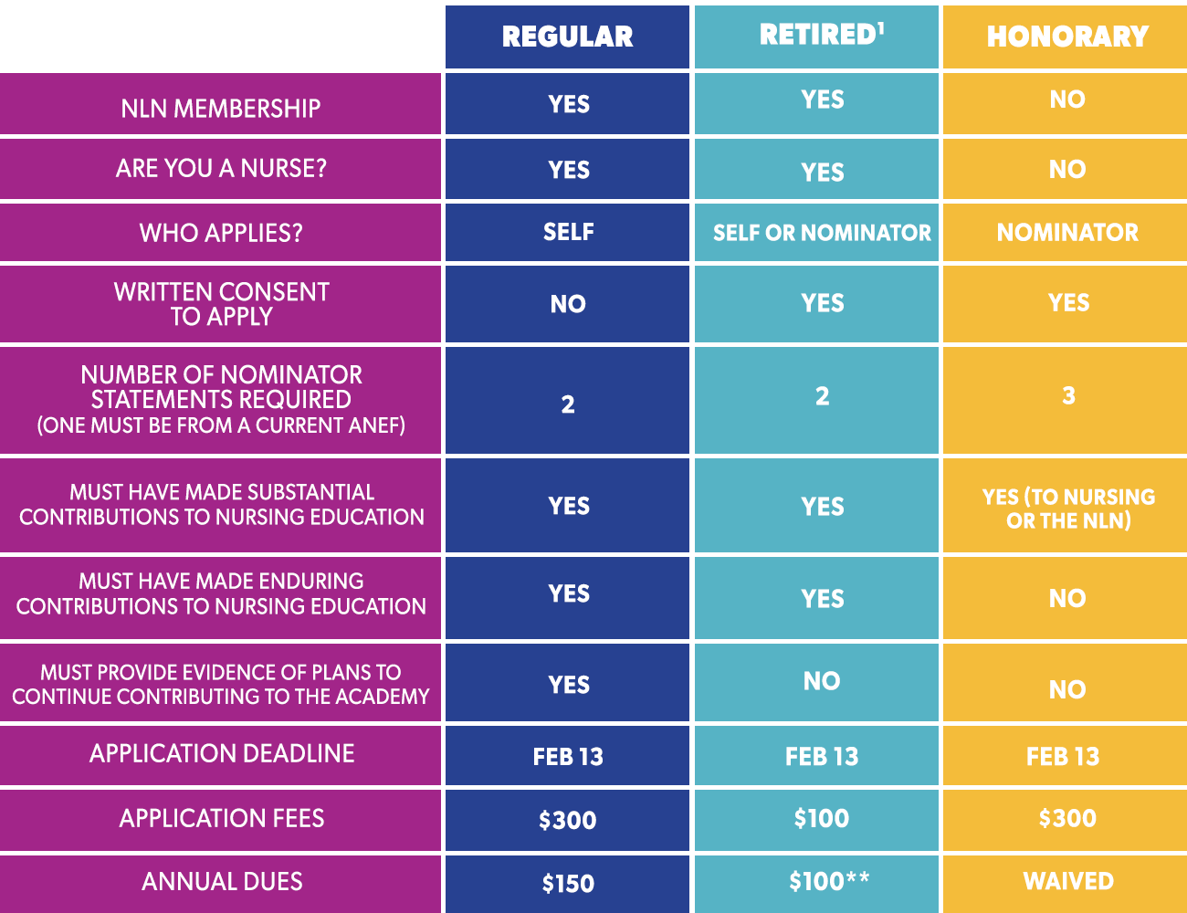 See the NLN Academy Handbook that corresponds with your application for a detailed look at application criteria (Regular, Retired or Honorary)